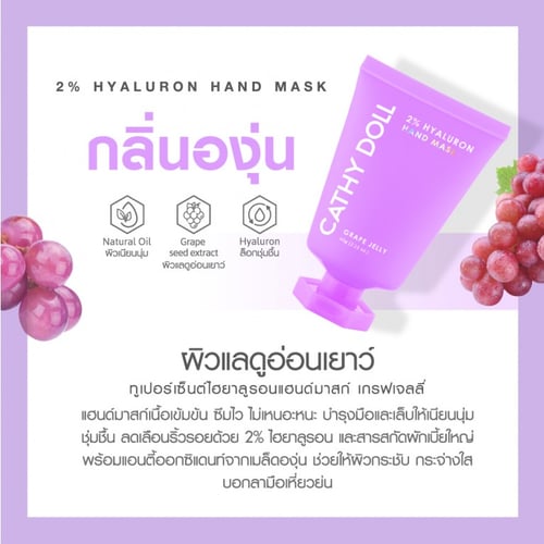 2.กลิ่นองุ่น มีสารสกัดจากเมล็ดองุ่น ที่มีสารต้านแอนตี้ออกซิแดนท์ (Antioxidant) ช่วยให้ผิวดูกระชับ บำรุงผิวมือให้ดูสดใส ไม่หมองคล้ำ บอกลามือเหี่ยวย่น หยาบกร้าน