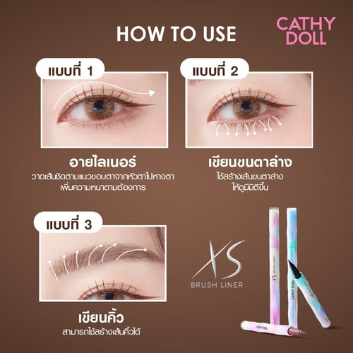 วิธีใช้ ดึงเปิดฝาผลิตภัณฑ์ ใช้อายไลเนอร์วาดเส้นชิดตามแนวขอบตาจากหัวตาไปหางตา เพิ่มความหนาตามต้องการ และสามารถใช้สร้างเส้นคิ้วได้ ปิดฝาให้สนิททุกครั้งหลังใช้