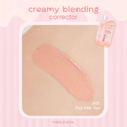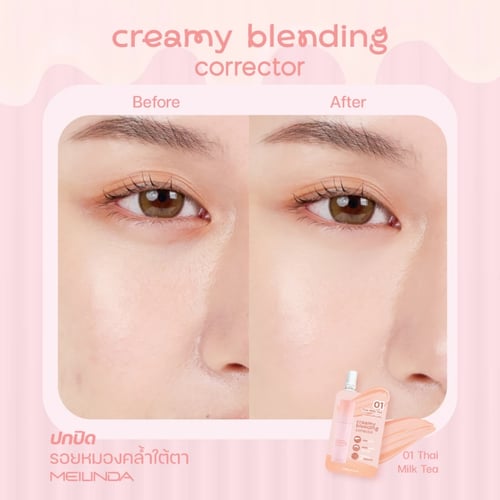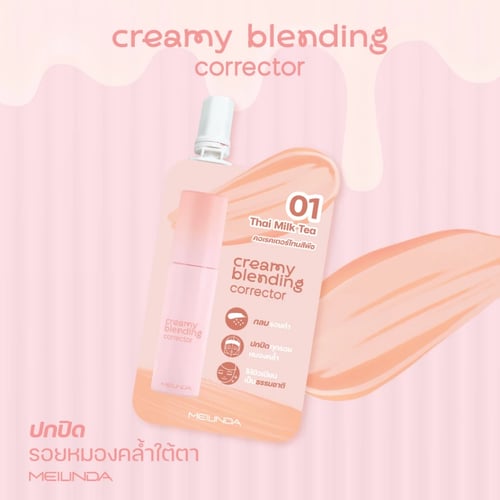 ให้ลงcreamy blending corrector 01 Thai Milk Tea โทนสีส้มพีช บริเวณใต้ตาก่อน และเลือกโทนสี creamy blending concealer สีที่สว่างกว่าผิว มาลงบริเวณใต้ตา ในขั้นตอนต่อไปเพื่อให้ใต้ตาสว่าง และให้ใบหน้าดูมีมิติมากขึ้น