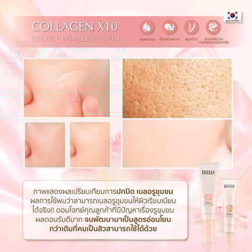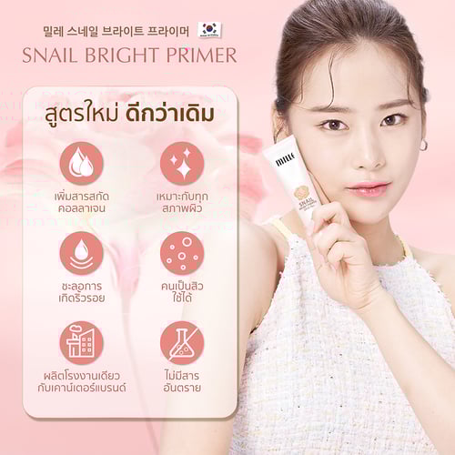 ผลิตภัณฑ์ไพรเมอร์สำหรับใช้ทาก่อนแต่งหน้า หรือ ผสมพร้อมกับ Mille Super Whitening Rose BB Cream ช่วยอำพรางรูขุมขน ให้ผิวเรียบเนียนพร้อมมอบความชุ่มชื้น ด้วยสารสกัดจากเมือกหอยทาก เพิ่มความยืดหยุ่นกระชับให้แก่ผิว ช่วยกระจายแสงให้ผิวใส ดูสุขภาพดี ไม่หมองคล้ำระหว่างวัน