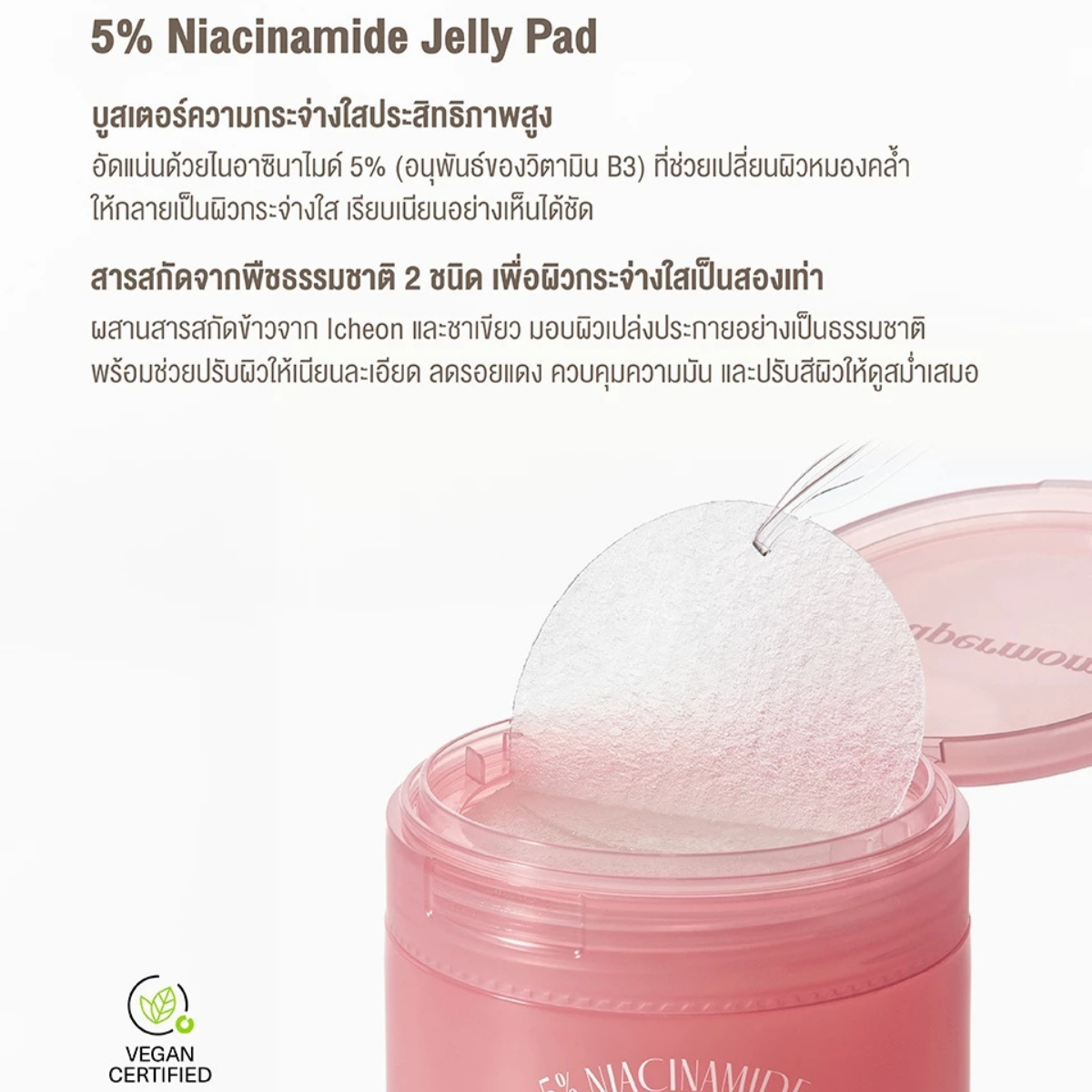อัดแน่นด้วยไนอาซินาไมด์ 5% (อนุพันธ์ของวิตามิน B3) ที่ช่วยเปลี่ยนผิวหมองคล้ำให้กลายเป็นผิวกระจ่างใส เรียบเนียนอย่างเห็นได้ชัด