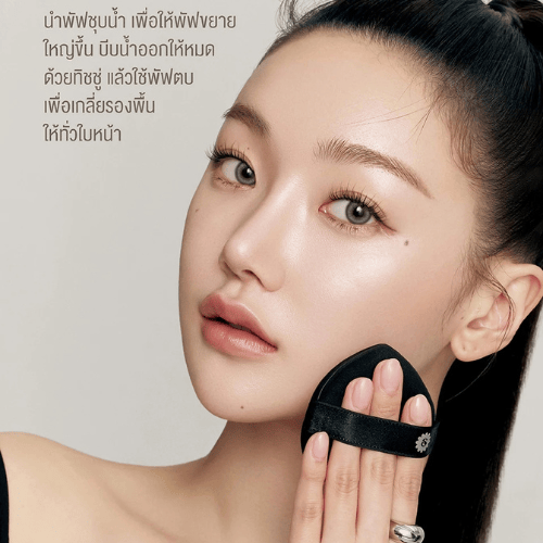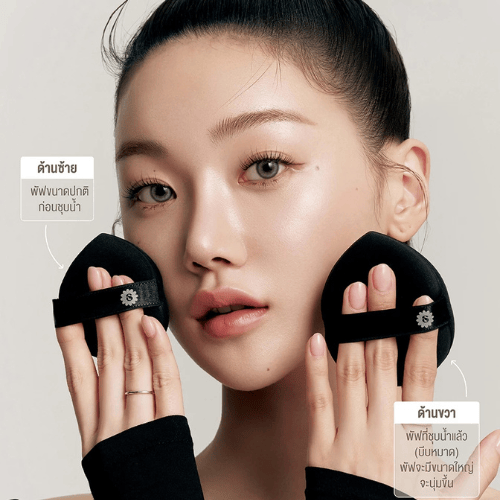 วิธีใช้ นำพัฟชุบน้ำ เพื่อให้พัฟขยายใหญ่ขึ้น บีบน้ำออกให้หมาดด้วยทิชชู่ แล้วใช้พัฟตบเพื่อเกลี่ยรองพื้นให้ทั่วใบหน้า