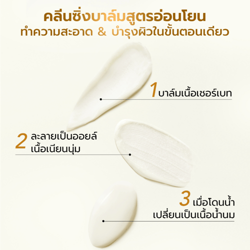 เนื้อบาล์มบางเบาคล้ายเชอร์เบทที่เปลี่ยนเป็นออยล์ เนื้อเนียนทันทีเมื่อลูบไล้ลงบนใบหน้า และละลายโดยไม่ทิ้งสารตกค้างเมื่อล้างออกด้วยน้ำสะอาด